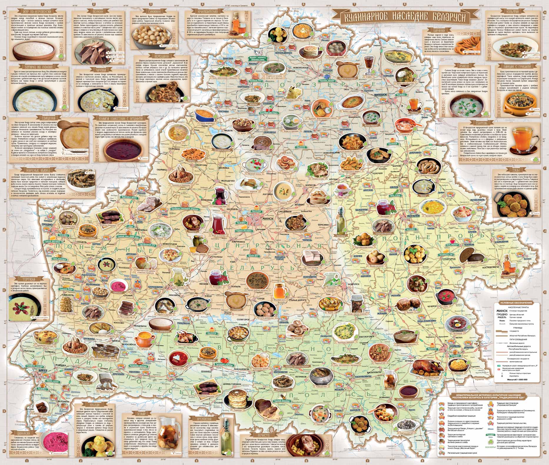 Карта призвана популяризовать местные кулинарные особенности, традиционные блюда и рецепты белорусской кухни и будет интересна жителям Беларуси, туристам и всем неравнодушным к кулинарным традициям Беларуси. Масштаб карты 1:850 000.