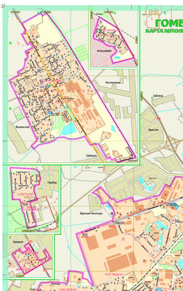 Маршруты гарадскога пасажырскага транспарту, пералік назваў вуліц, тэматычны ўказацель. Маштаб 1 : 16 000.