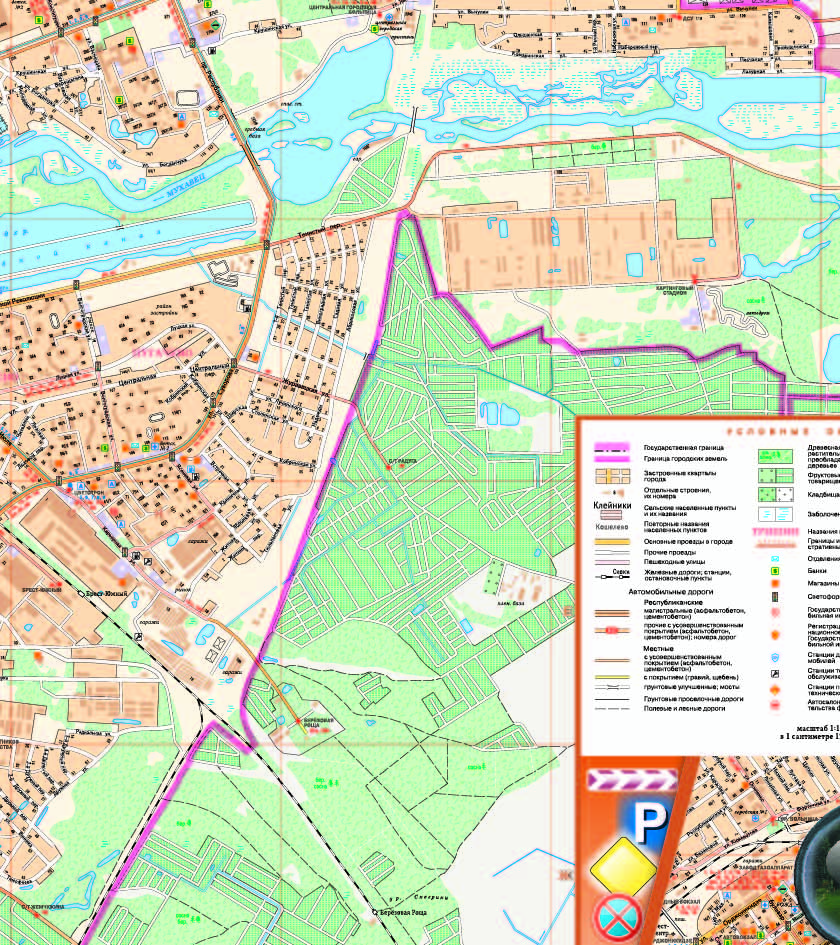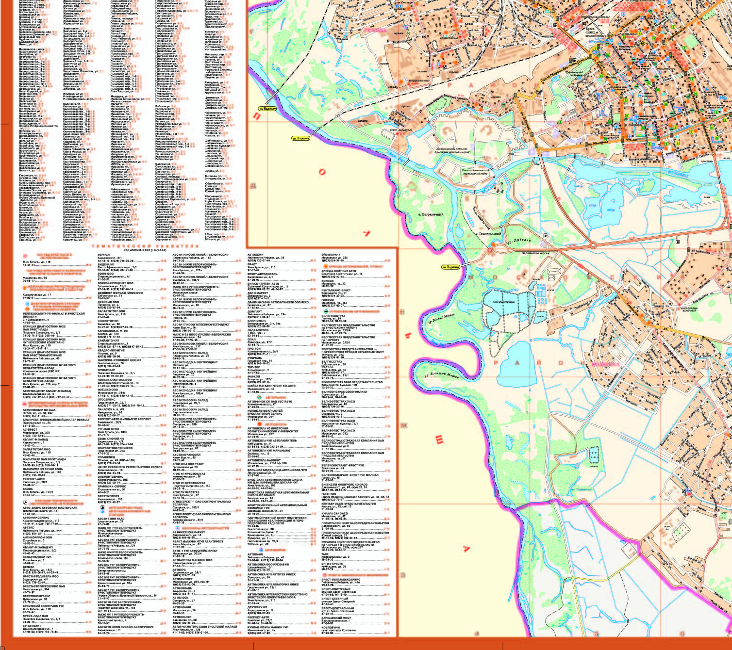 Маршруты городского пассажирского транспорта, перечень названий улиц, тематический указатель. Масштаб 1:19 000.