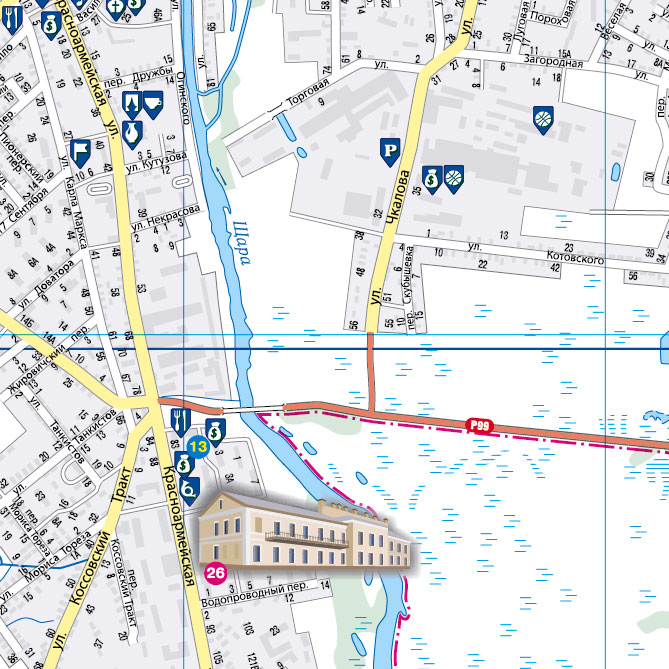 Туристская карта. Подробный план центральной части города, достопримечательности, объекты индустрии туризма.