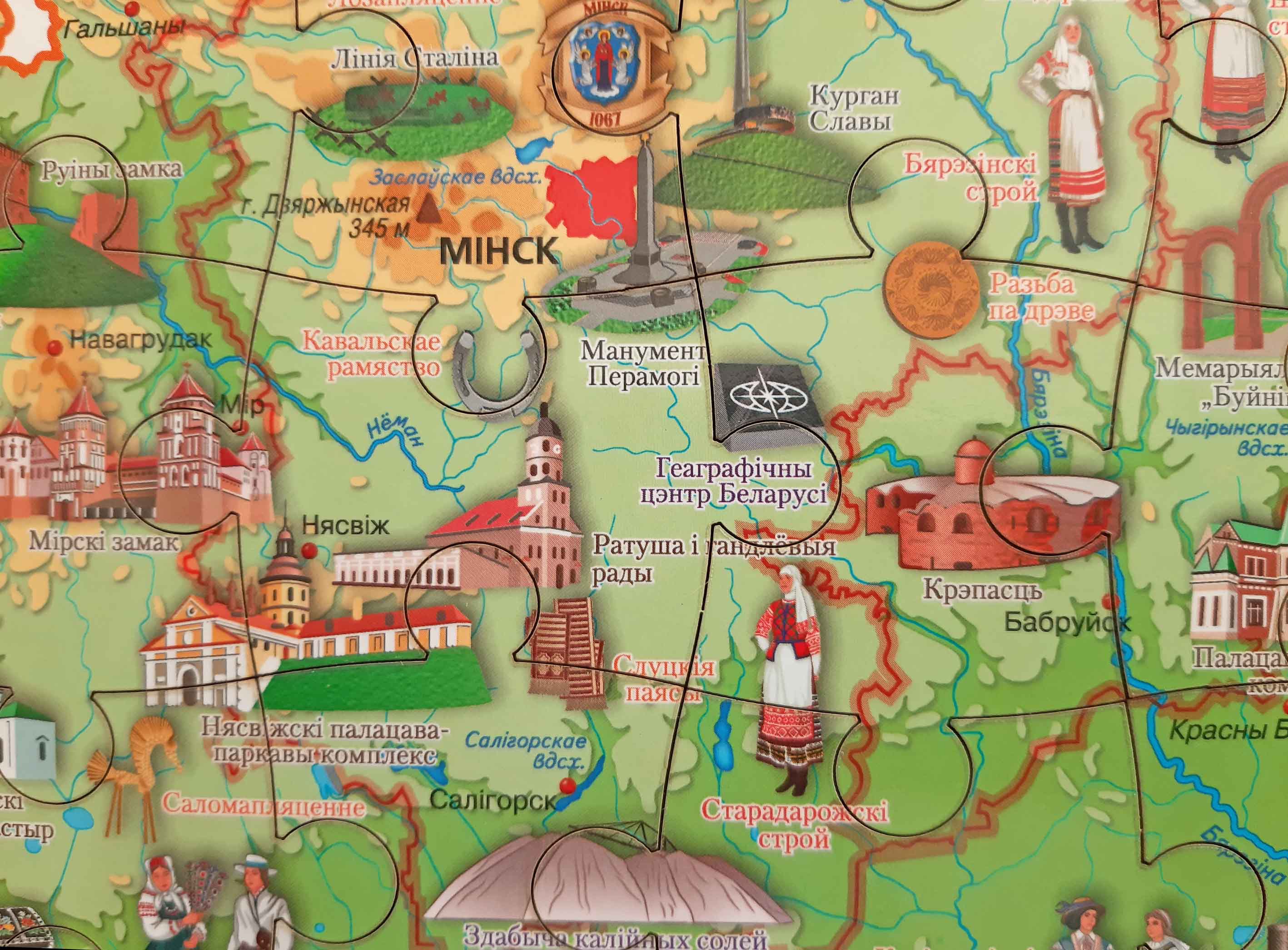 Карта-пазл в легкой игровой форме поможет ознакомить ребенка с географией, народными и культурными традициями, знаковыми памятниками архитектуры Беларуси. Карта-пазл выполнена на прочной деревянной основе и содержит крупные детали. Собирая пазл, ребенок развивает логическое мышление, мелкую моторику, творческие и умственные способности. Карта-пазл изготовлена из лакированного ДВП высокой плотности.