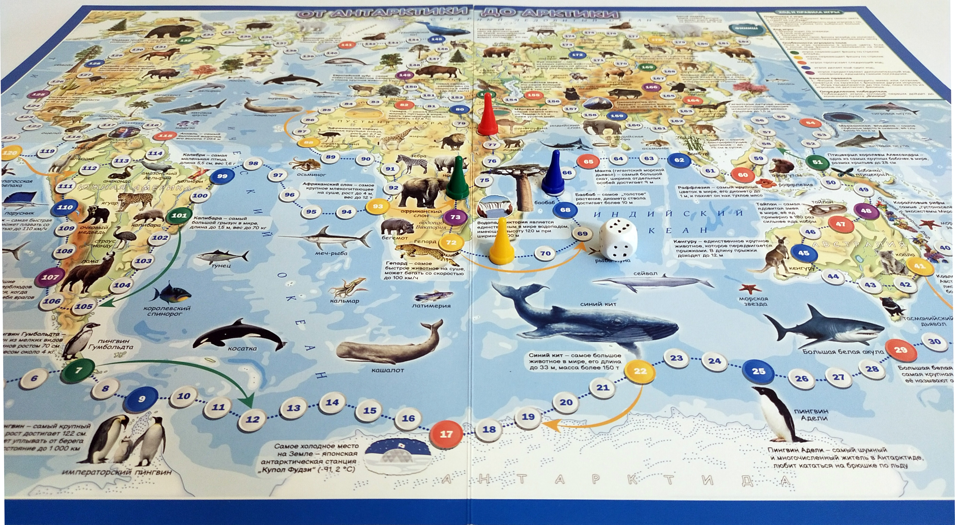 Карта-игра «От Антарктики до Арктики» предлагает игрокам увлекательное путешествие от Южного полюса до Северного, через все континенты и океаны нашей планеты. Во время прохождения маршрута, участники погрузятся в удивительный мир природы Земли, а благодаря текстовым вставкам, расположенным на карте, расширят свой кругозор и узнают много интересных фактов о самых удивительных явлениях и объектах природы.