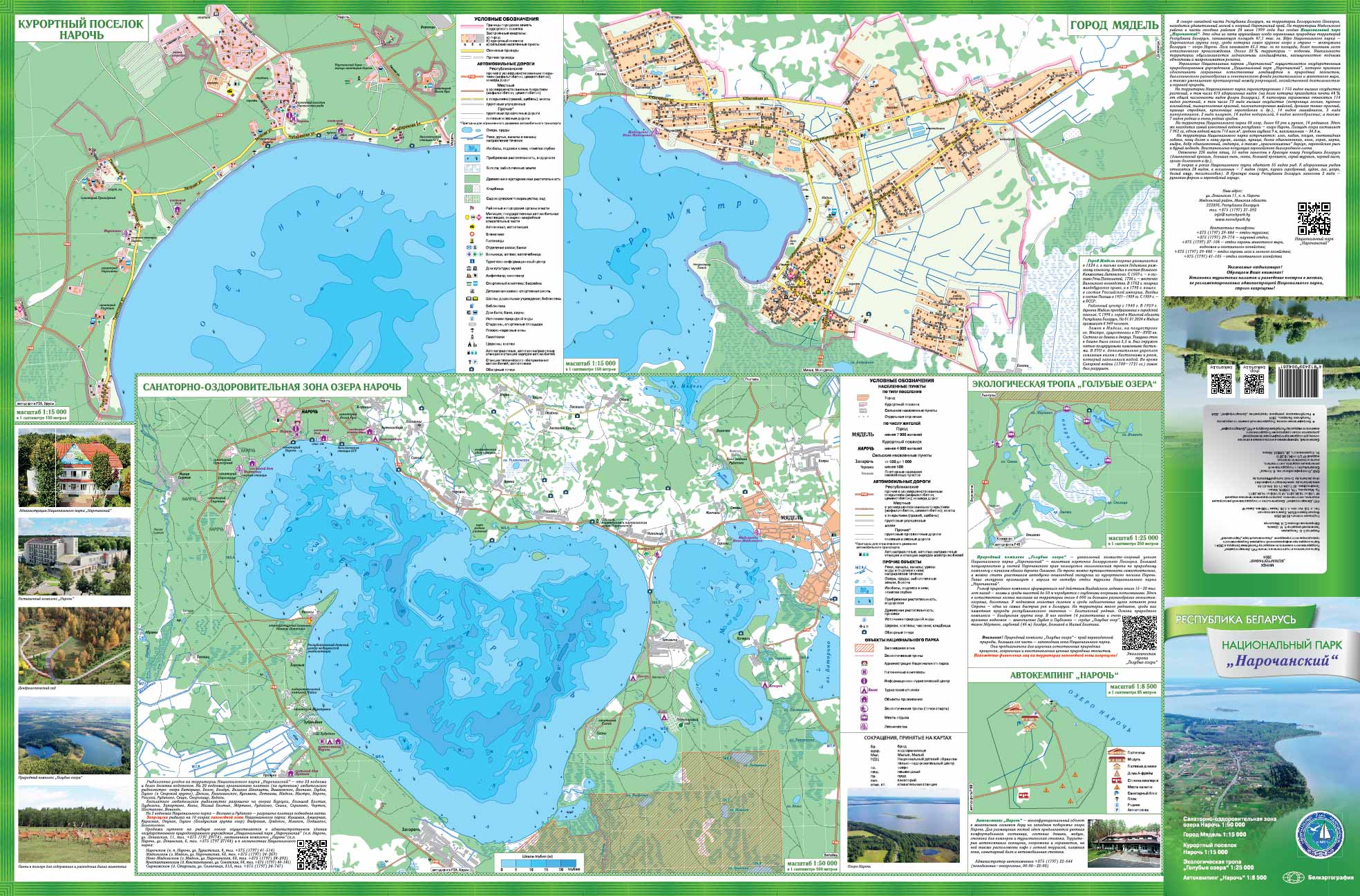 На карте даются: современная граница национального парка "Нарочанский", туристические стоянки с названиями, обзорные точки, экскурсионно-туристские объекты, историко-культурные ценности объекты, родники, фотографии, текстовая справочная информация. Карта дополняется QR-кодами.