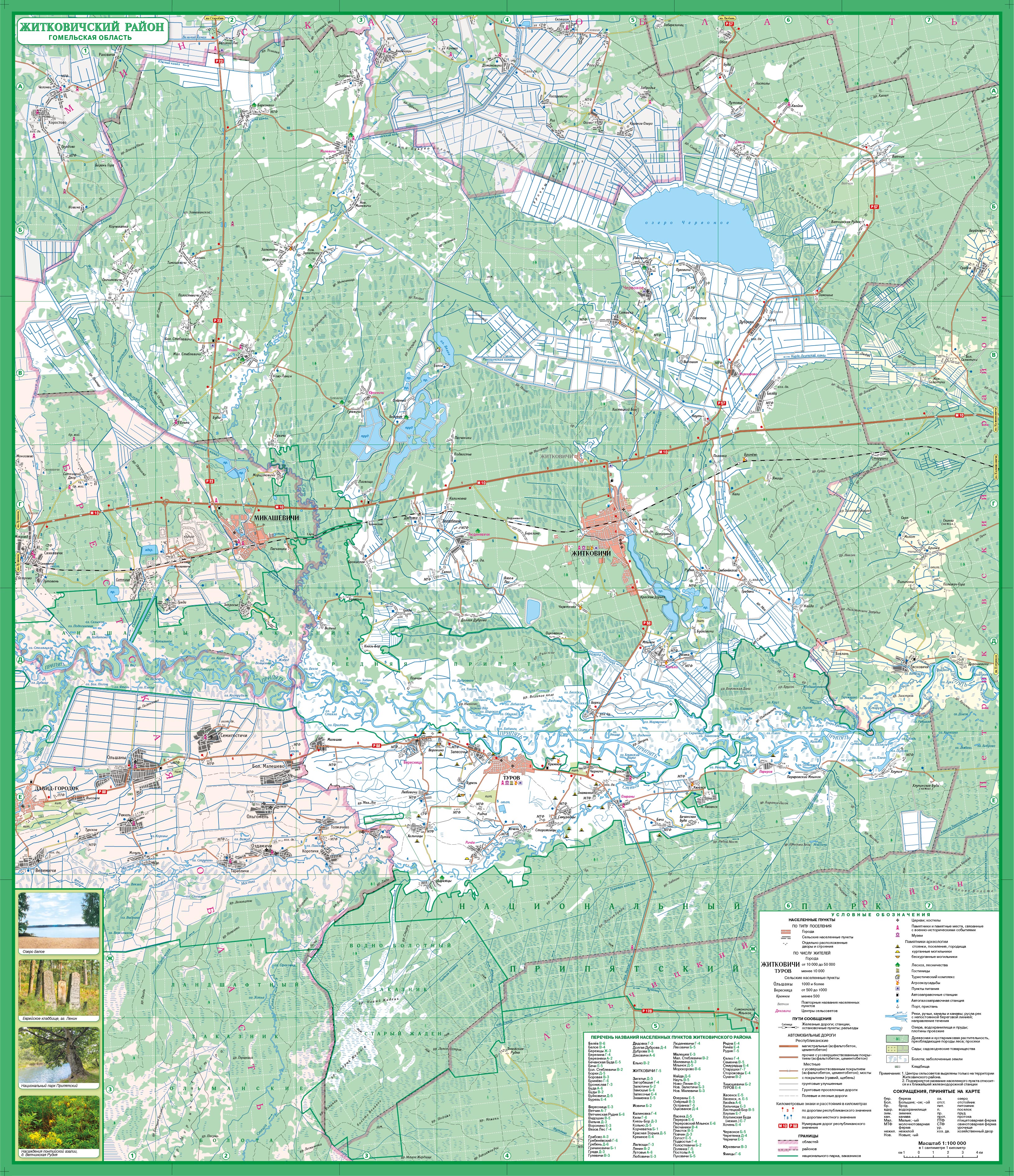 На карте Житковичского района обозначены гидрография, населенные пункты (с указанием центров сельсоветов), пути сообщения, растительность и достопримечательности, а также планы городов Житковичи и Туров с указанием названий улиц, нумерацией домов. Обозначены все значимые объекты инфраструктуры города и достопримечательности.