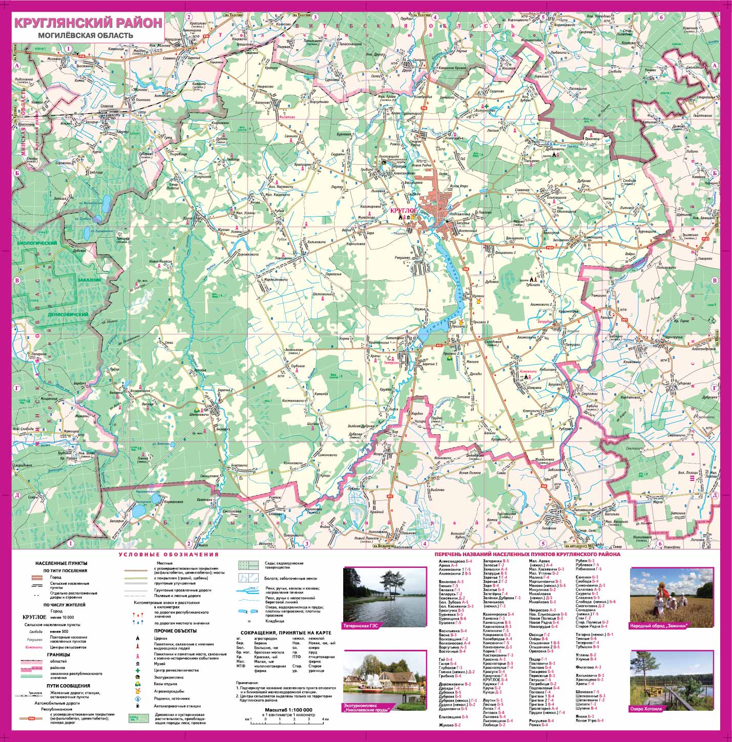 На одной стороне издания вы найдете подробную карту Круглянского района, на которой обозначены гидрография, населенные пункты (с указанием центров сельсоветов), пути сообщения, растительность и достопримечательности.