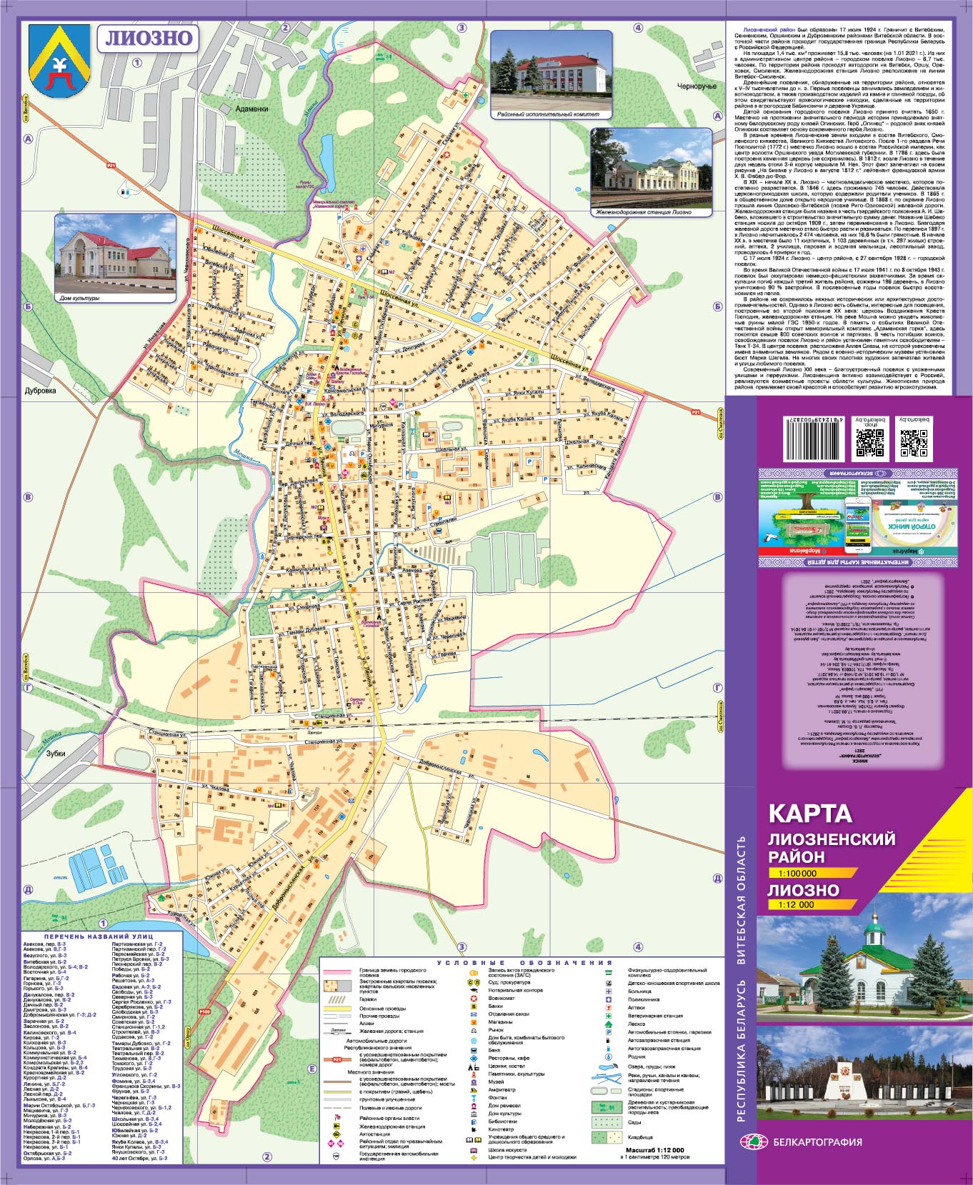 На другой стороне расположен подробный план Лиозно с указанием названий улиц, нумерацией домов. Обозначены все значимые объекты инфраструктуры поселка и достопримечательности.