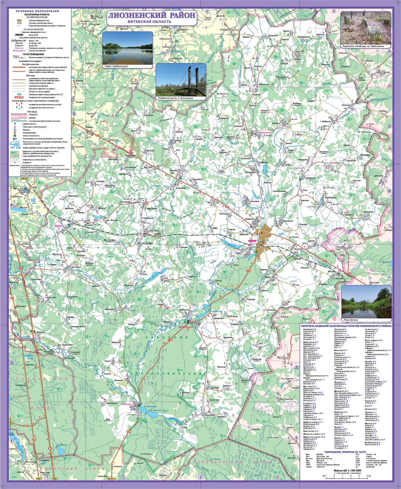 На одной стороне издания вы найдете подробную карту Лиозненского района, на которой обозначены гидрография, населенные пункты (с указанием центров сельсоветов), пути сообщения, растительность и достопримечательности.